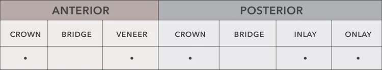 - Posterior: crown and inlays/onlays